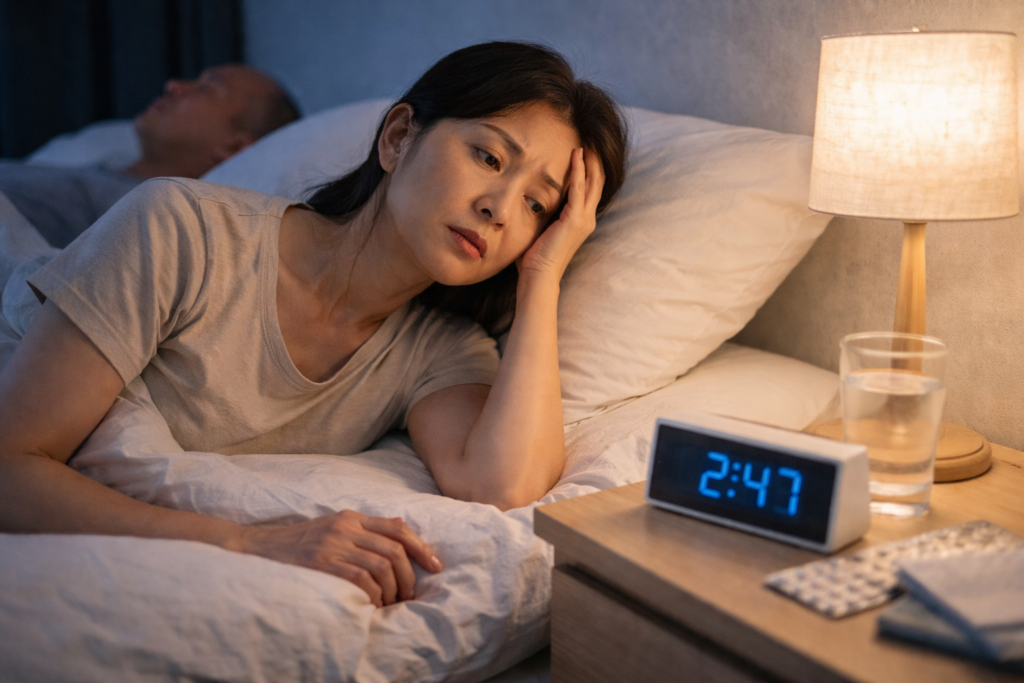 寝つきが悪い・途中で目が覚める・日中の強い眠気——これらは更年期の典型的な睡眠トラブルです。